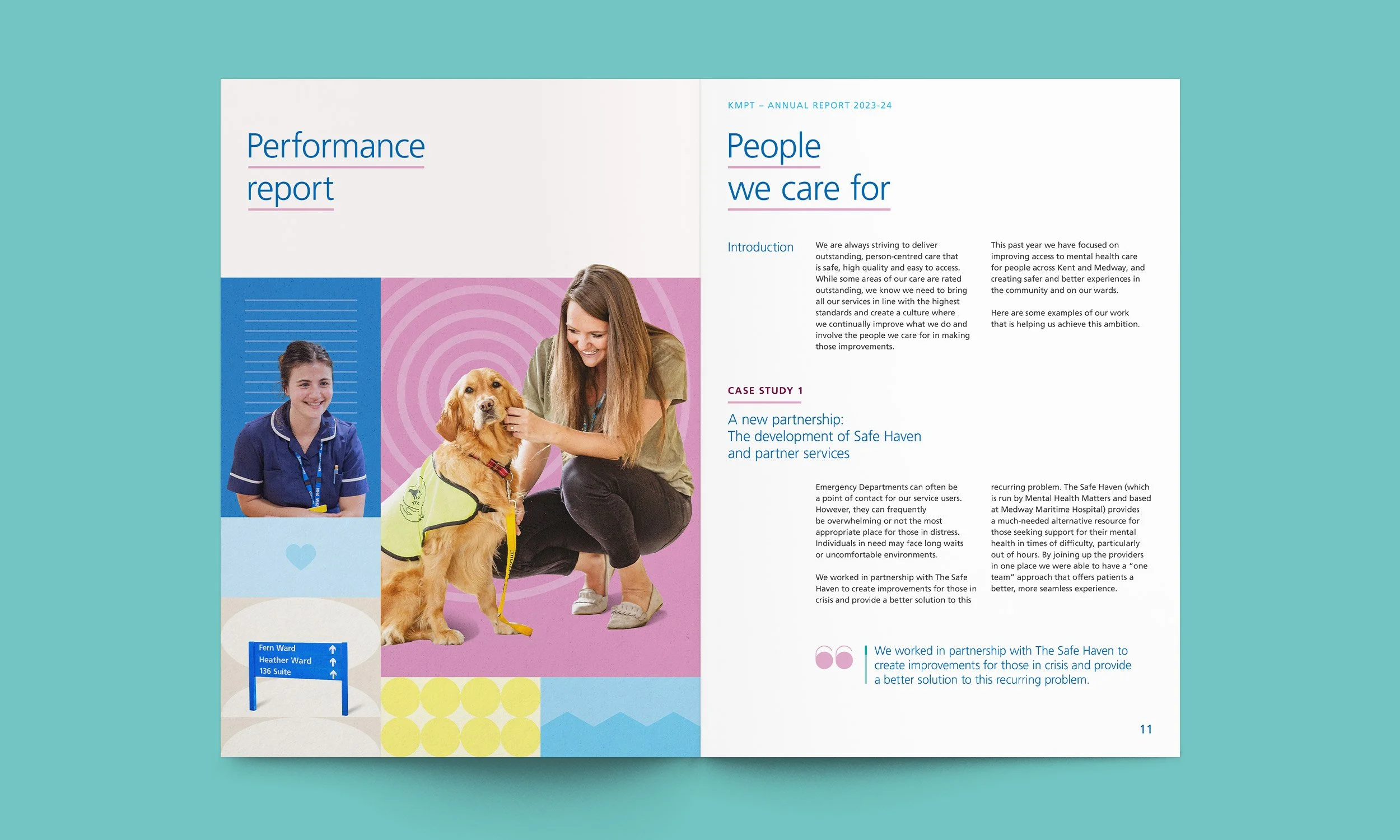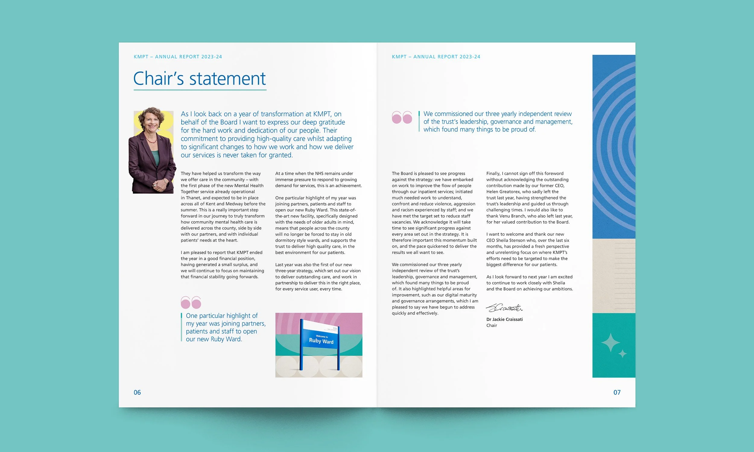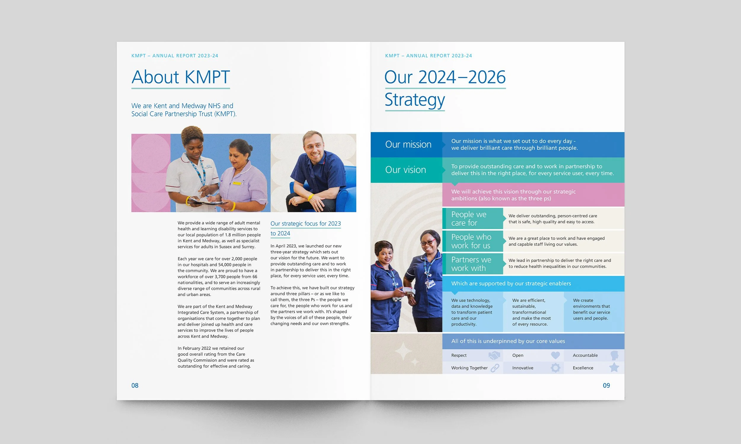 Kent & Medway NHS and Social Care Partnership Trust (KMPT) provide outstanding mental health services across South East England, both in the community and within inpatient settings. For the third year running, KMPT got in touch to request I design their Annual Report. The brief from their end was minimal, but we agreed we wanted to have feelings of positivity and looking forwards represented somehow in the design.