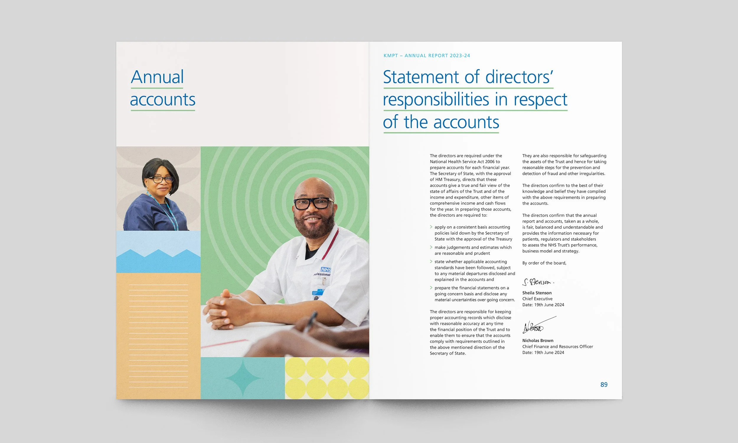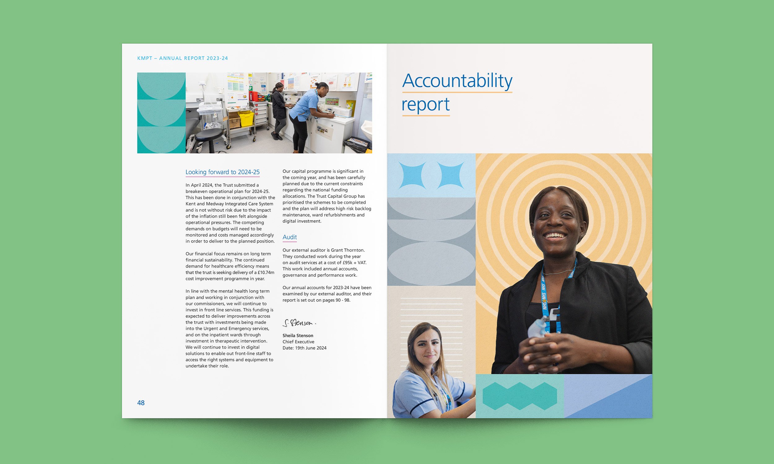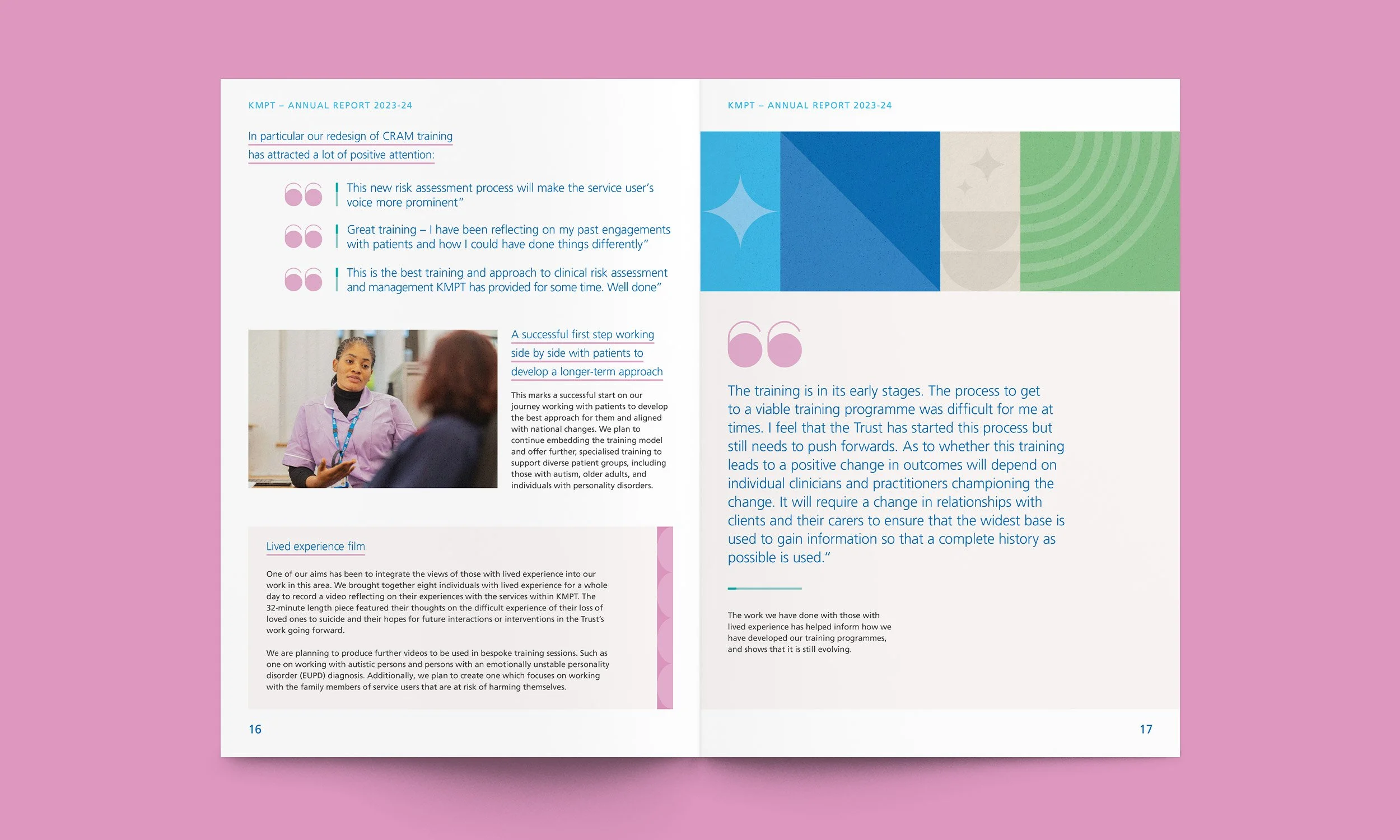 Kent & Medway NHS and Social Care Partnership Trust (KMPT) provide outstanding mental health services across South East England, both in the community and within inpatient settings. For the third year running, KMPT got in touch to request I design their Annual Report. The brief from their end was minimal, but we agreed we wanted to have feelings of positivity and looking forwards represented somehow in the design.